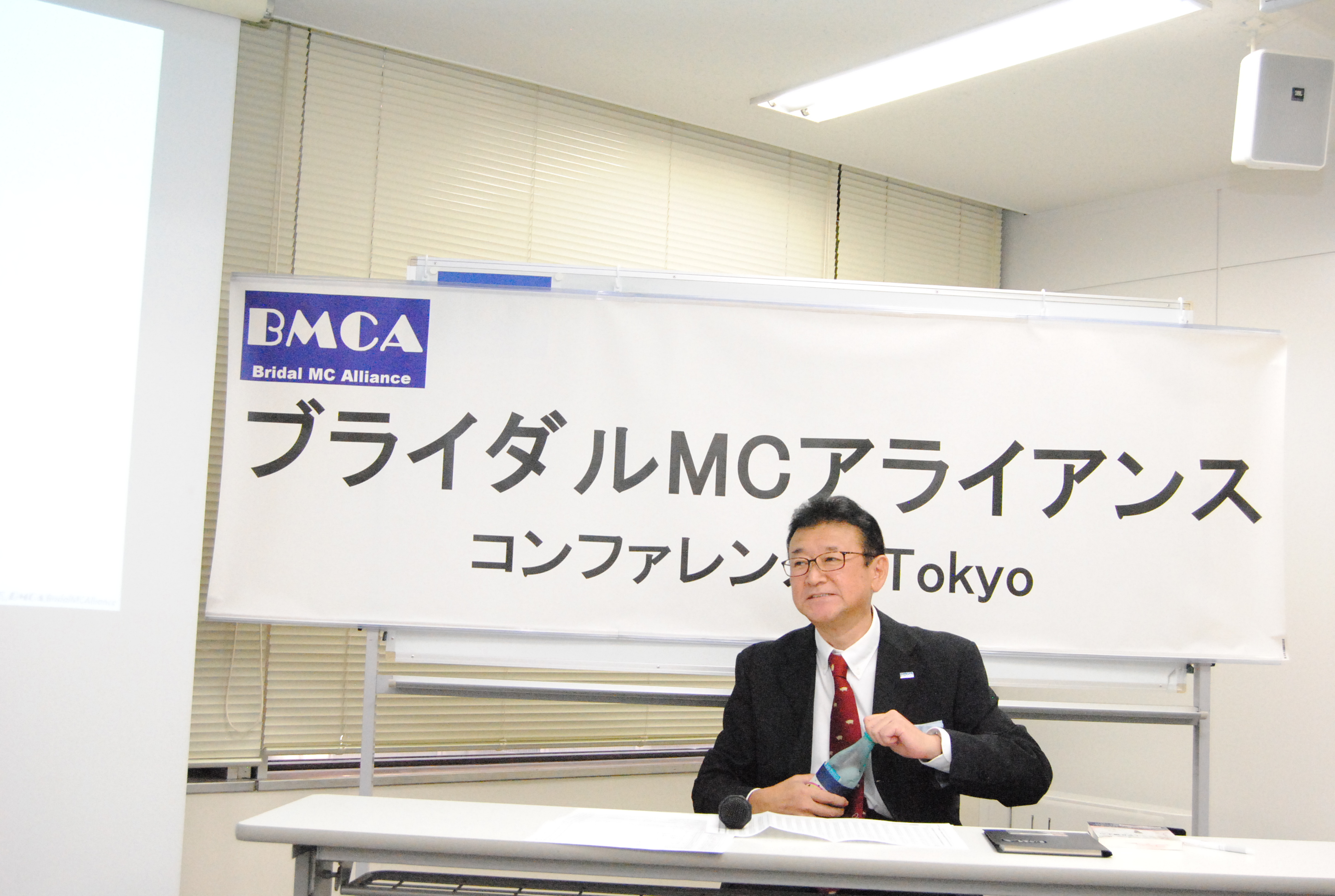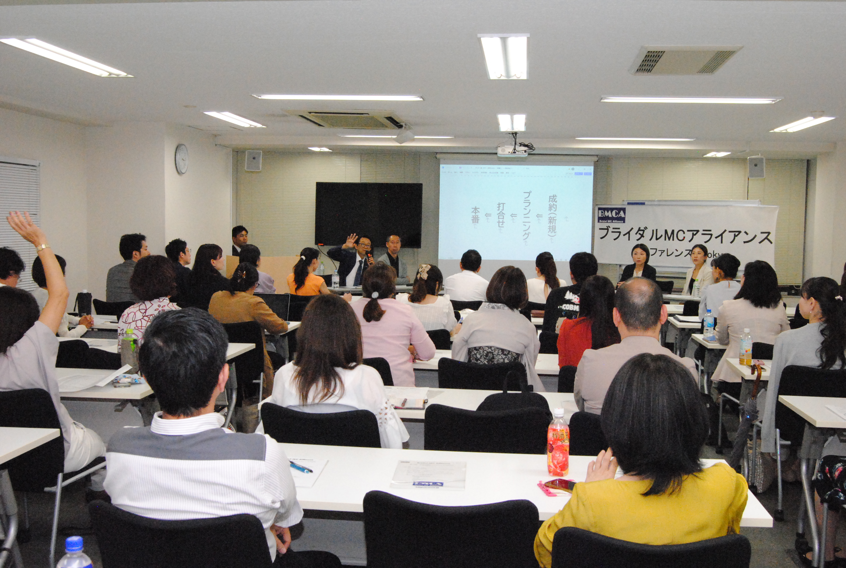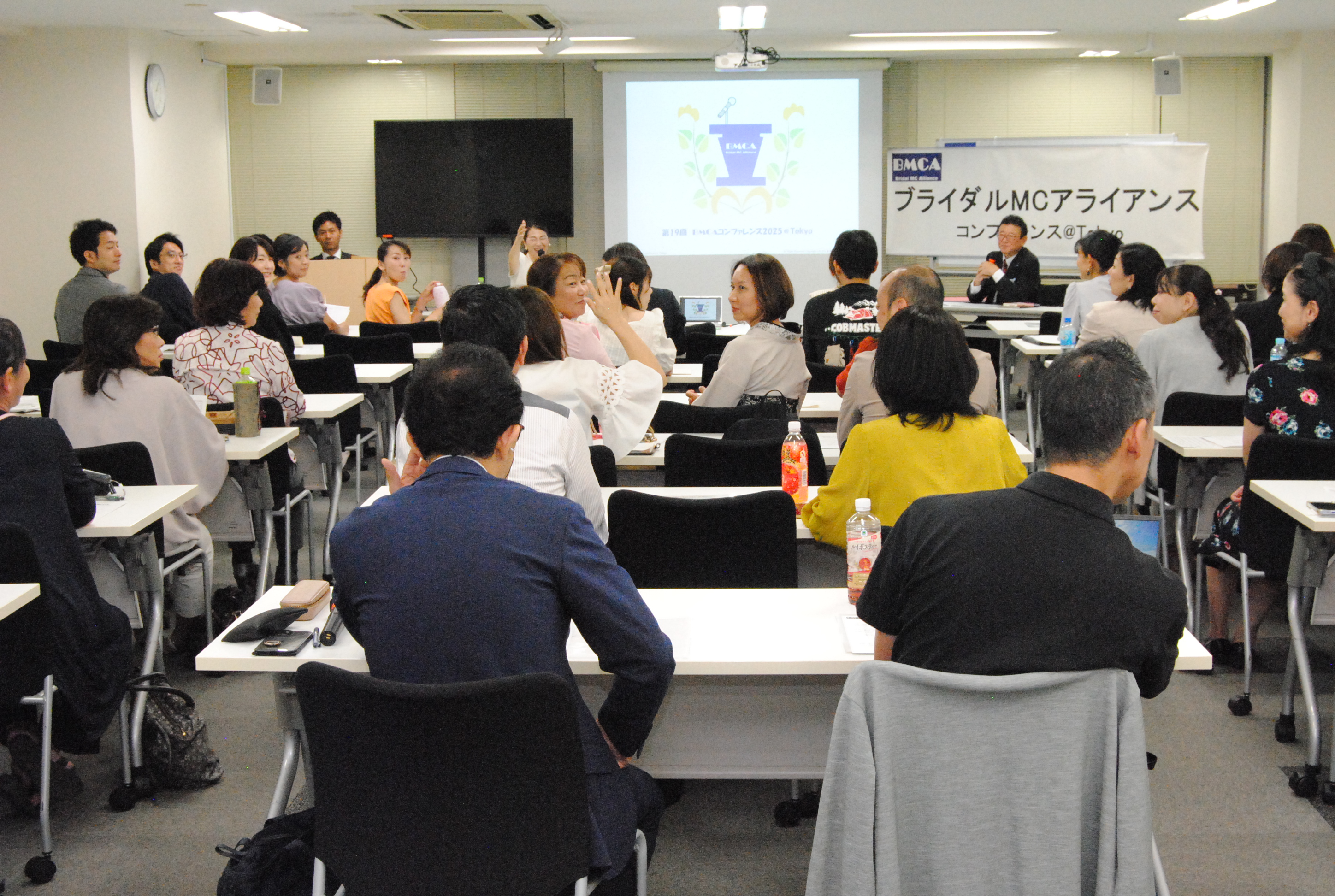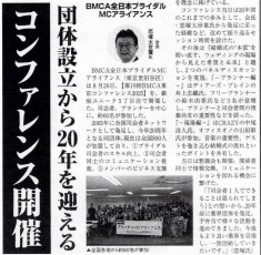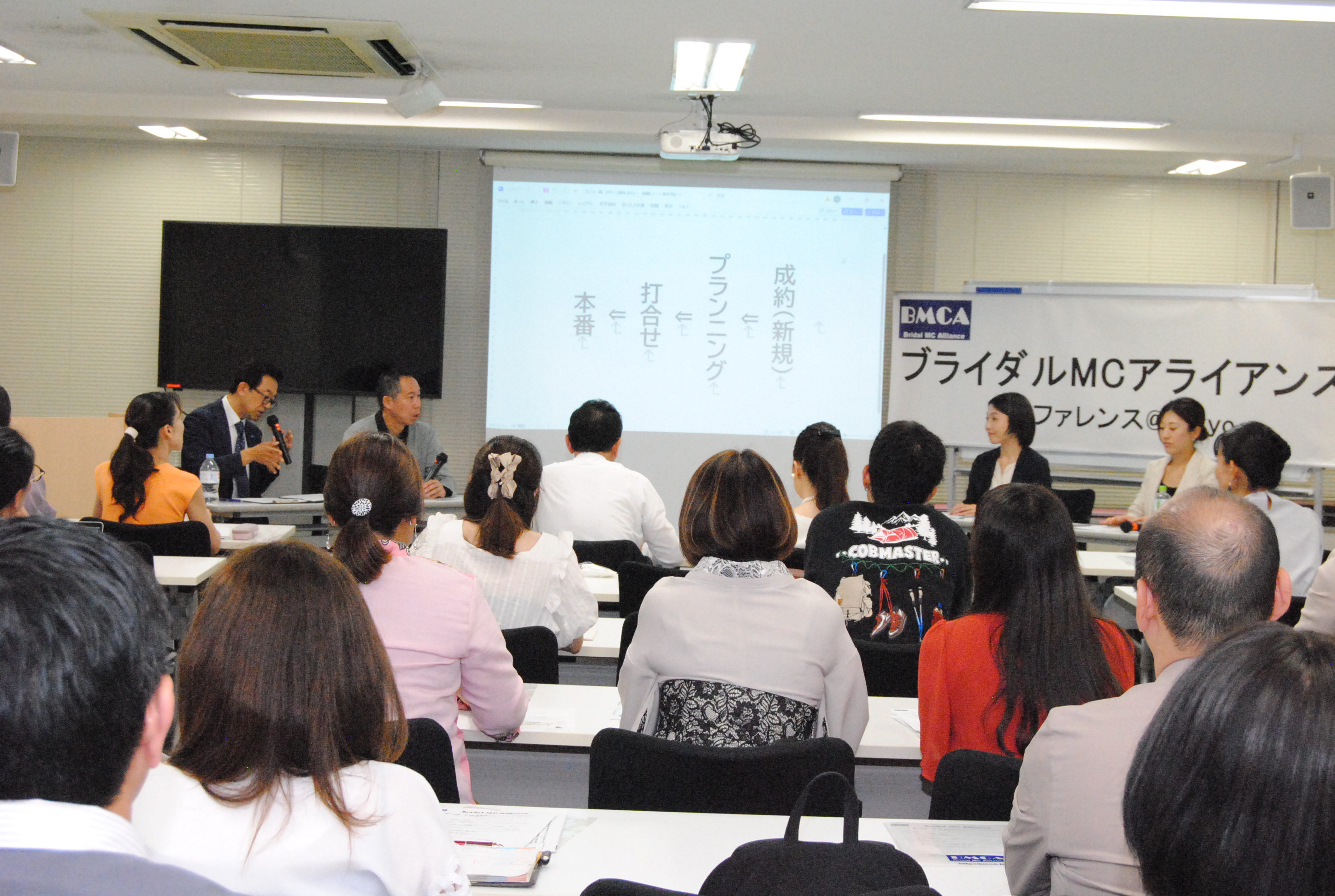 年に1回開催の年次総会(集合勉強会)であるBMCAコンファレンスを8月26日、東京中央区銀座にて開催しました。 今年はBMCA設立20周年の集合開催となりました。北は青森から、南は沖縄まで司会者、プランナー、会場キャプテン、音響スタッフ等、計57名参集しました。 今回も、総合司会は、デビュー2年目の若手MCにお願いしました。参加者みんながパワーと、元気をもらいました。 1つ目のセッションでは「BMCA20年レビュー」と題し、恋塚会長にBMCAこの20年を振り返って頂きました。 そして、「結婚式の本質を問い直す、ウェディングの現場から見えた希望と未来」をテーマにパネルディスカッションを2回戦行いました。 エンディングでは、20周年記念と言うことで、幹部有志から、恋塚会長へサプライズプレゼントが贈られました。 閉会後は、会場を近隣の飲食店に移し、37名による懇親会も行われました。たくさんの面々が意見を交わす大変有意義な1日となりました。