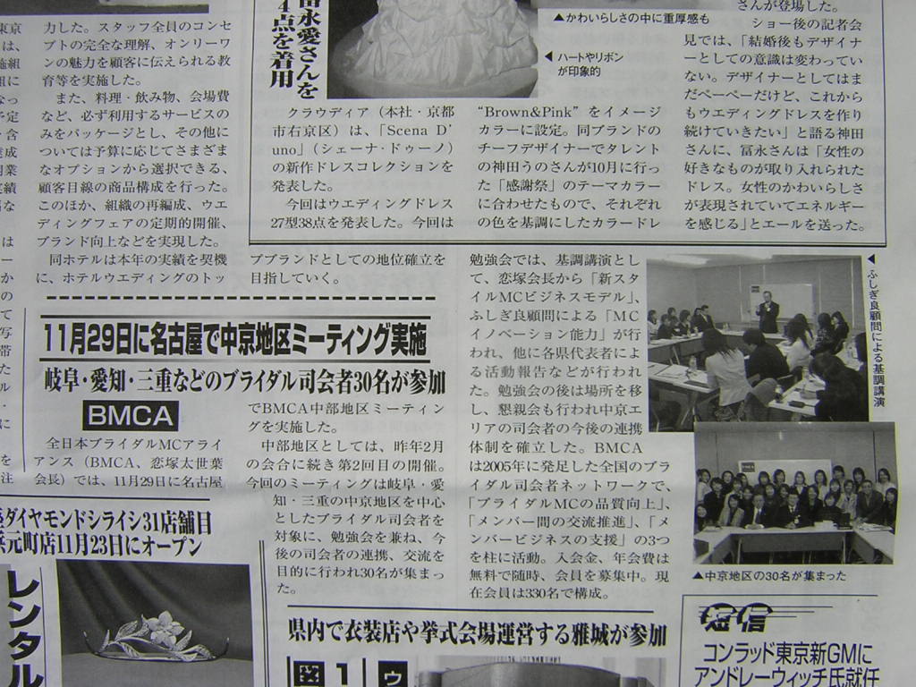 ブライダル産業新聞12月11日号にBMCA名古屋ミーティングの記事が掲載されました。中部地区でのBMCAの活動をアピールすることが出来ました。