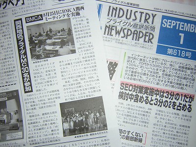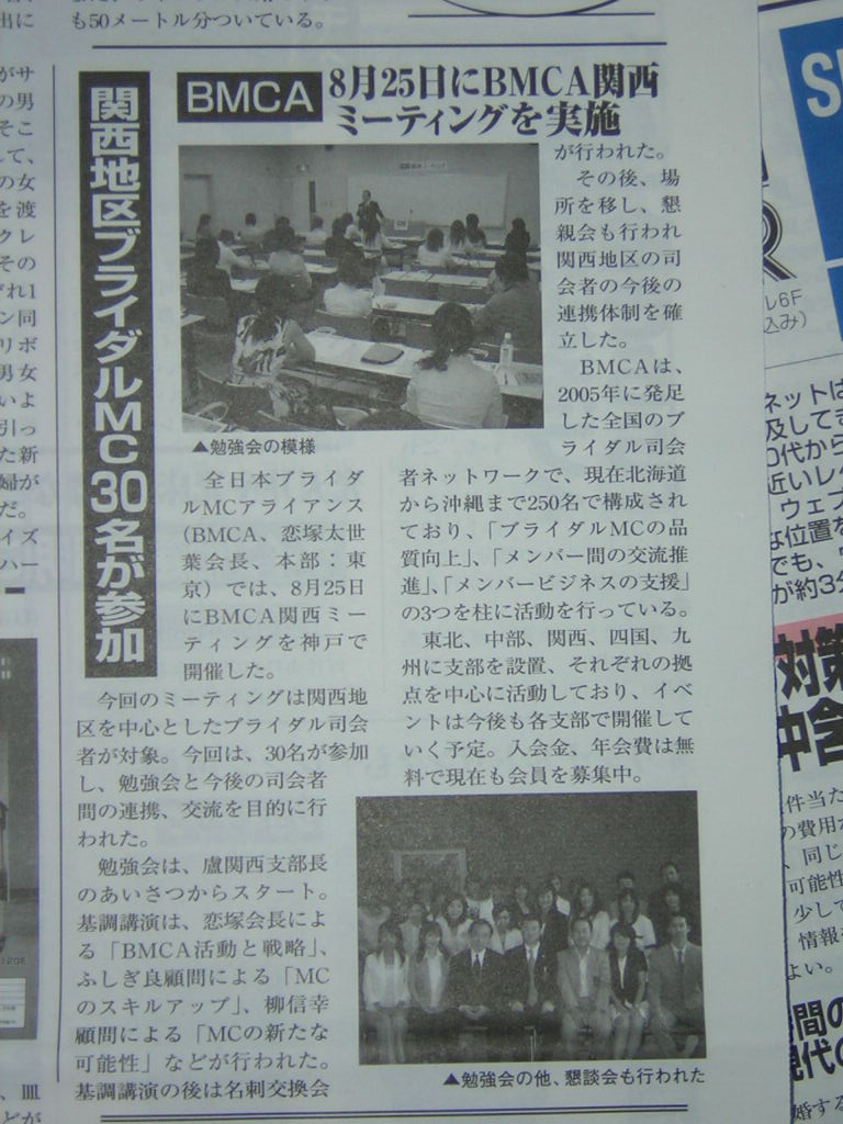 ブライダル産業新聞9月1日号にBMCA関西ミーティングの記事が掲載されました。関西地区でのBMCAの活動をアピールすることが出来ました。