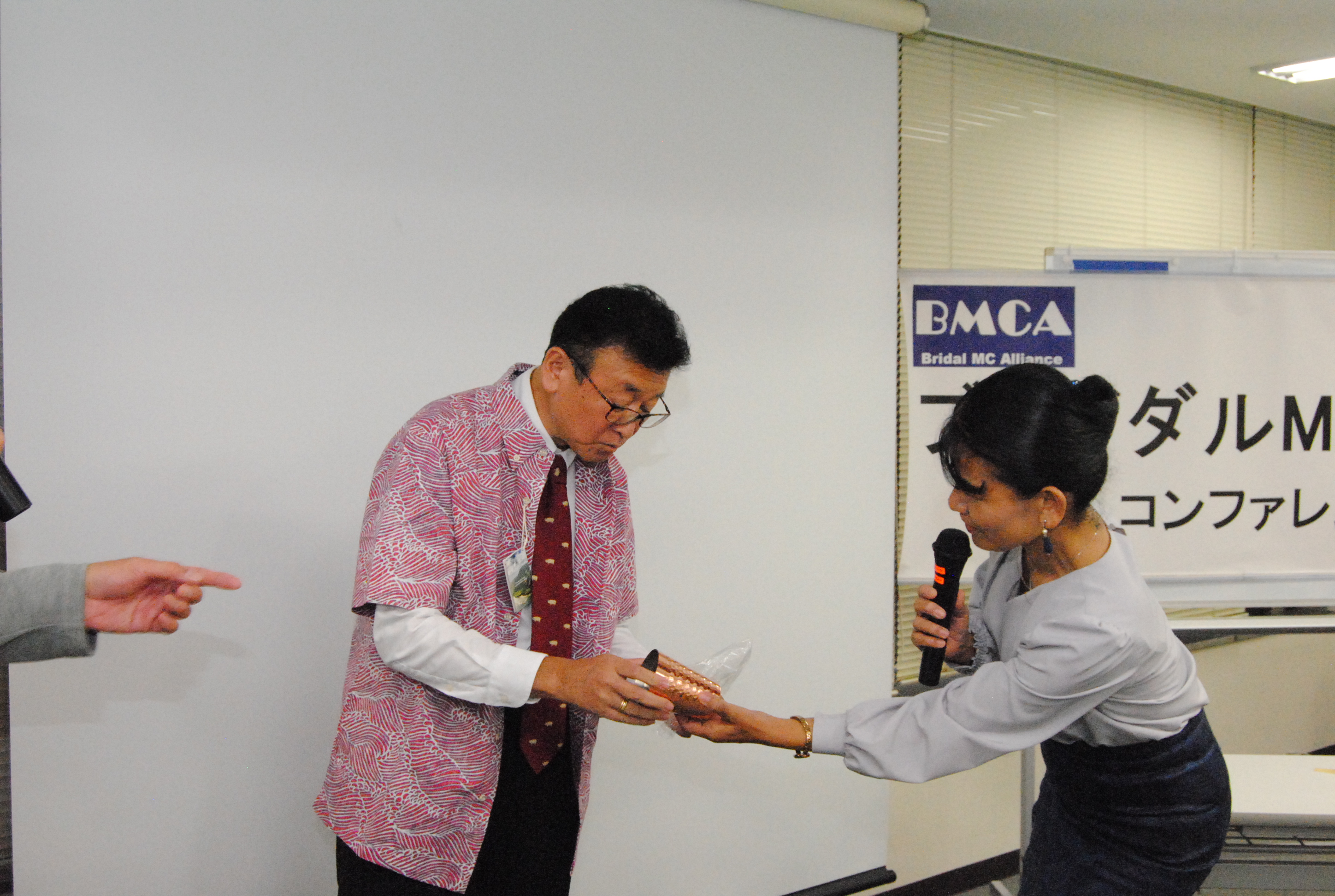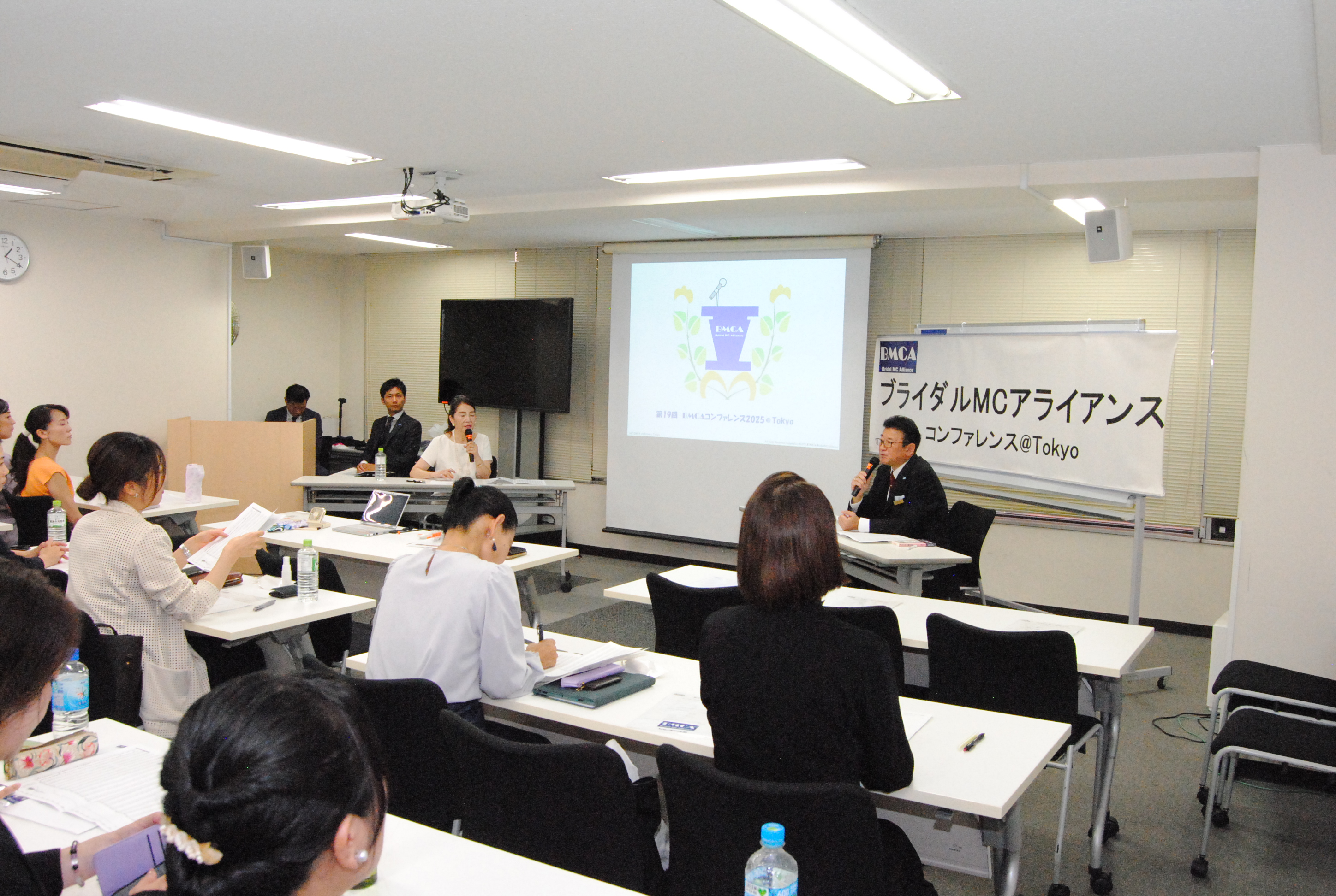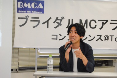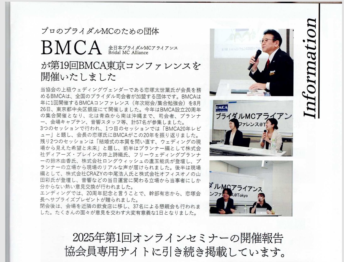 年に1回開催の年次総会(集合勉強会)であるBMCAコンファレンスを8月26日、東京中央区銀座にて開催しました。 今年はBMCA設立20周年の集合開催となりました。北は青森から、南は沖縄まで司会者、プランナー、会場キャプテン、音響スタッフ等、計57名参集しました。 今回も、総合司会は、デビュー2年目の若手MCにお願いしました。参加者みんながパワーと、元気をもらいました。 1つ目のセッションでは「BMCA20年レビュー」と題し、恋塚会長にBMCAこの20年を振り返って頂きました。 そして、「結婚式の本質を問い直す、ウェディングの現場から見えた希望と未来」をテーマにパネルディスカッションを2回戦行いました。 エンディングでは、20周年記念と言うことで、幹部有志から、恋塚会長へサプライズプレゼントが贈られました。 閉会後は、会場を近隣の飲食店に移し、37名による懇親会も行われました。たくさんの面々が意見を交わす大変有意義な1日となりました。